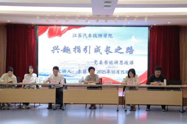 2025 年 10 月 15 日下午,江苏汽车技师学院广陵校区近 80 名学生代表在综合楼三楼报告厅,聆听了学院党委书记以 “兴趣指引成长之路” 为主题的思政课。学校教务处、基础部、马克思主义学院负责人参加了此次活动。