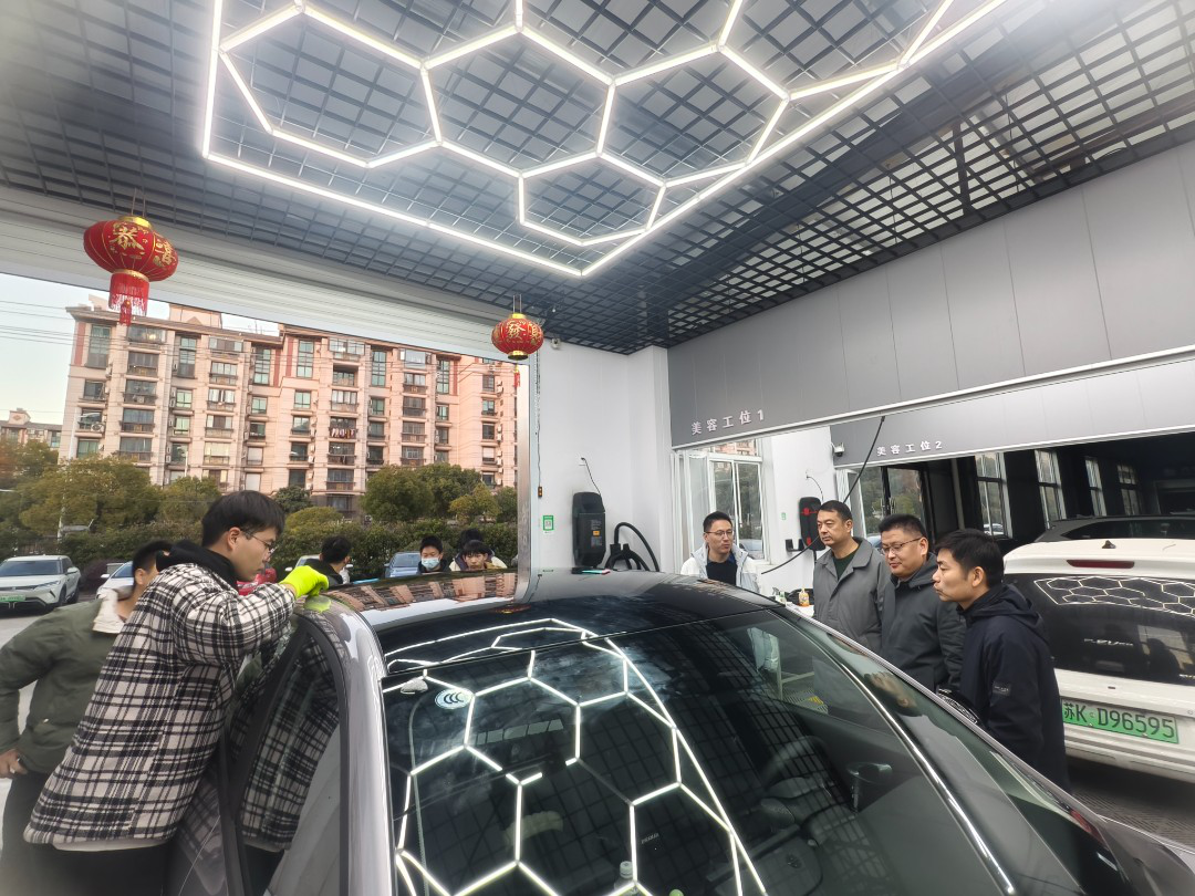 此次活动特政凯名车技术顾问胡鹏晨老师进校授课,以 “车顶黑色改色膜精装” 为主题,进行了全流程演示。胡老师系统讲解车顶贴膜的技术难点与工艺标准,并现场演示了精准定位、热塑定型及天窗细节处理等核心技艺,充分展现了行业高标准的操作规范。学院领导表示邀请行业专家走进实训课堂,是将产业最新技术、工艺与标准融入教学的重要途径,也是深化产教融合、提升人才培养质量的有力举措,未来将与企业开展更多实质性合作项目。
